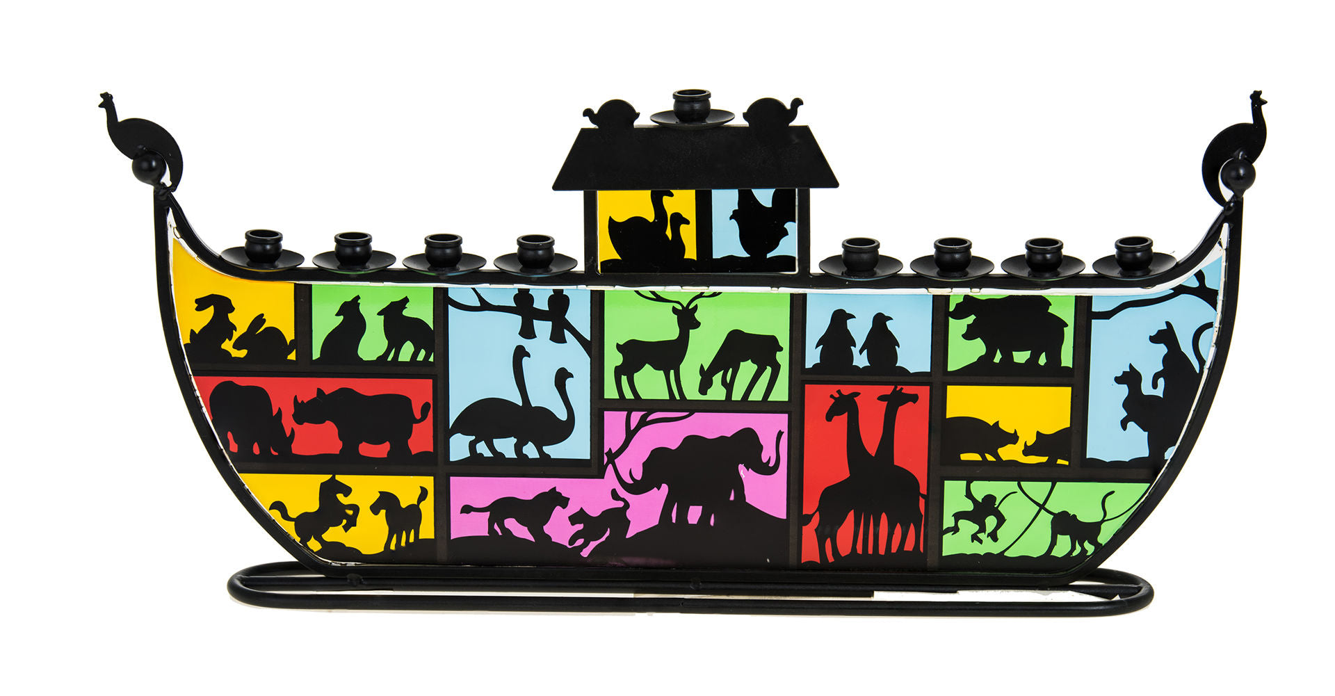 Metall and glass Noahs Arch Menorah, Two by Two. Length 15" and 6.5" high.