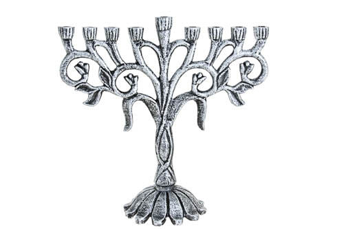 Tulip Silver Metal Menorah. The Length is 9.25 inch, and the height is 9.25 inch. The round base is 4.0 inch. Also available in Gold.
