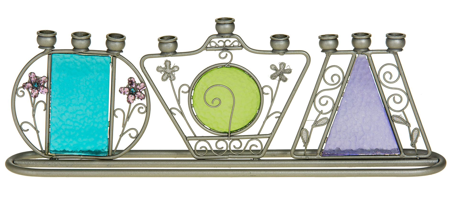 Petite and sweet, the Garden is ideal for pre-teens and anyone seeking a small stylish menorah. Graceful vines and metal flowers surround gumdrop colored glass and crystals. Dimensions:10.5" x 3.5". Wt:  From the Menorah Collection by Copa judaica.