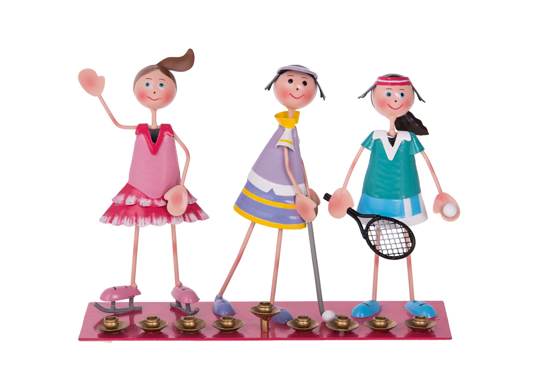 New menorah 2016. Sporting Girls Menorah. The Sporting Girls Menorah has one skater, one golfer and one tennis player. Made of metal. The menorah is 11.75 inch long, 3.80 inch wide and 9.50 inch high.