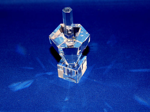 A thick platform of hand cut, hand polished clear crystal forms the hexagonal top of this collectible dreidel. Below, beautifully faceted triangular pieces taper to a narrow point. Multiple planes and surfaces add plenty of sparkle. Hebrew letters encircle the crystal stem on the flat, hexagonal surface. Crystal stand included. 3.5" high. Gift Box. Dimensions: 2"x2"x3.5". Wt: .65 pound. From the dreidel collection by Copa Judaica.
