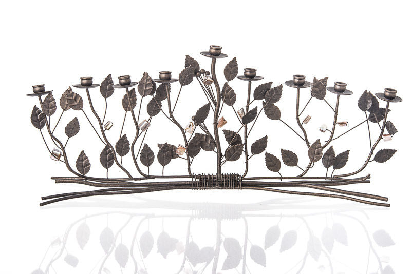 This metal bronze menorah has tan and cream color pearls as flowers. From the Menorah Collection by Copa Judaica. Measures
