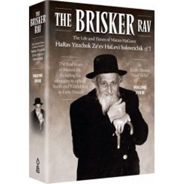 - The fourth and final volume of this monumental series, spans the years from 5716 (1956) up until the Brisker Rav's passing in 5719 (1959). In addition to chapters depicting his greatness in Torah and his leadership qualities, much is written to portray his extensive efforts toward upholding traditional Torah values, including his battle against the Zionist authority's insistence on watered down Yiddishkeit and the establishment of a modern - day Sanhedrin. The last chapter chronicles Maran's final days, as well as his petirah and levayah.