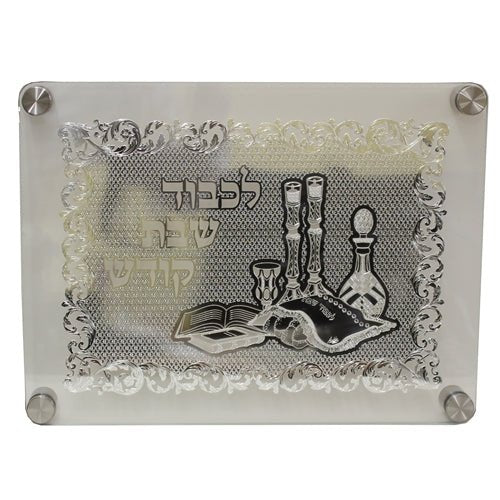 Tempered Glass Challah Tray On Legs With Lazer Cut Design - Silver - 15.5W x 11.75L 1.5H