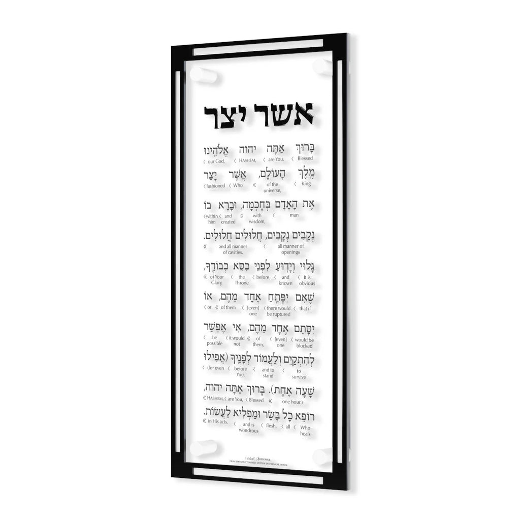 The Classic Asher Yatzar wall decor gives an elegant and sophisticatedtouch to any washing area. Printed on clear acrylic with 3D title andBorders. Also available in Artscroll Interlinear version.Dimensions 6" x 13"Wall standoffs includedBlackBlueGoldSku (Click Here For Options)FA-AYC01BARBarcode053517133488MaterialLuciteColorBlackSize6" x 13"The Classic Asher Yatzar wall decor gives an elegant and sophisticated touch to any washing area. Printed on clear acrylic with 3D title and Borders. Also available in Artscroll Interlinear version. Dimensions 6" x 13" Wall standoffs includedThe Classic Asher Yatzar wall decor gives an elegant and sophisticatedtouch to any washing area. Printed on clear acrylic with 3D title andBorders. Also available in Artscroll Interlinear version.Dimensions 6" x 13"Wall standoffs includedBlackBlueGoldSku (Click Here For Options)FA-AYC01BARBarcode053517133488MaterialLuciteColorBlackSize6" x 13"