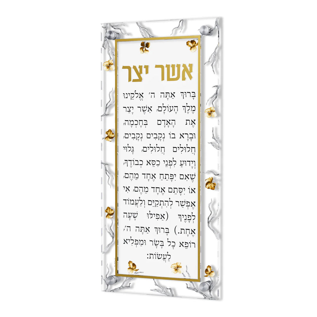 The Golden Branch Asher Yatzar wall decor gives an elegant andsophisticated touch to any washing area. Printed on clear acrylic withraised 3D title and Borders.Dimensions 6" x 13"Wall standoffs includedSkuFA-AYGB01Barcode535171350482MaterialLuciteSize6" x 13"The Golden Branch Asher Yatzar wall decor gives an elegant and sophisticated touch to any washing area. Printed on clear acrylic with raised 3D title and Borders. Dimensions 6" x 13" Wall standoffs includedThe Golden Branch Asher Yatzar wall decor gives an elegant andsophisticated touch to any washing area. Printed on clear acrylic withraised 3D title and Borders.Dimensions 6" x 13"Wall standoffs includedSkuFA-AYGB01Barcode535171350482MaterialLuciteSize6" x 13"