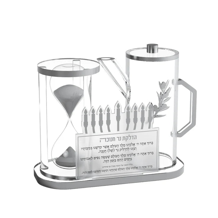 Enhance your Chanukah celebrations with the stunning Feldart Collection Lucite Hourglass and Oil Jug Set. Made from high-quality lucite, this set adds a touch of elegance to your holiday traditions. The hourglass design symbolizes the miracle of oil lasting eight days, while the oil jug holds enough oil for all eight nights. Elevate your holiday with this beautiful set.