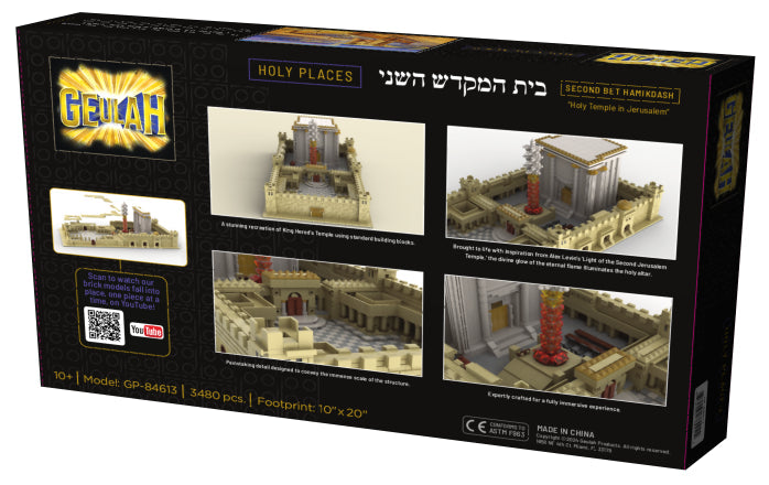 This is an artistic representation of the Second Temple after the renovations of Herod the Great in the first century BCE. It is an original interpretation of a 2000 year old structure of which there are no pictures or paintings. Jewish law has many conflicting opinions as to various aspects of the specific design, Geulah Products makes no claims as to accuracy of the model according to Jewish law. Within the confines of creating a model made from building blocks, many aspects of this model are specifically not correct according to any opinion. This design was inspired by Alex Levin's "Light of the Second Temple" painting (artlevin.com), and borrows ideas from several other models and illustrations in sefarim. This model is an original artistic creation, and copies or reproductions of this model are illegal under United States Copyright law, and under halacha. Violations will be prosecuted to the full extent of the law. It is absolutely issur b'halacha for any retail outlet to sell copies of this model, or any other model that is a copy of any originaldesign.Watch the brick models fall into place, one piece at a time!SkuATT-GM-GP24613Barcode850064780017Age6+Size3.5" x 10" x 15"This is an artistic representation of the Second Temple after the renovations of Herod the Great in the first century BCE. It is an original interpretation of a 2000 year old structure of which there are no pictures or paintings. Jewish law has many conflicting opinions as to various aspects of the specific design, Geulah Products makes no claims as to accuracy of the model according to Jewish law. Within the confines of creating a model made from building blocks, many aspects of this model are specifically not correct according to any opinion. This design was inspired by Alex Levin's "Light of the Second Temple" painting (artlevin.com), and borrows ideas from several other models and illustrations in sefarim. This model is an original artistic creation, and copies or reproductions of this model are illegal under United States Copyright law, and under halacha. Violations will be prosecuted to the full extent of the law. It is absolutely issur b'halacha for any retail outlet to sell copies of this model, or any other model that is a copy of any originaldesign. Watch the brick models fall into place, one piece at a time!This is an artistic representation of the Second Temple after the renovations of Herod the Great in the first century BCE. It is an original interpretation of a 2000 year old structure of which there are no pictures or paintings. Jewish law has many conflicting opinions as to various aspects of the specific design, Geulah Products makes no claims as to accuracy of the model according to Jewish law. Within the confines of creating a model made from building blocks, many aspects of this model are specifically not correct according to any opinion. This design was inspired by Alex Levin's "Light of the Second Temple" painting (artlevin.com), and borrows ideas from several other models and illustrations in sefarim. This model is an original artistic creation, and copies or reproductions of this model are illegal under United States Copyright law, and