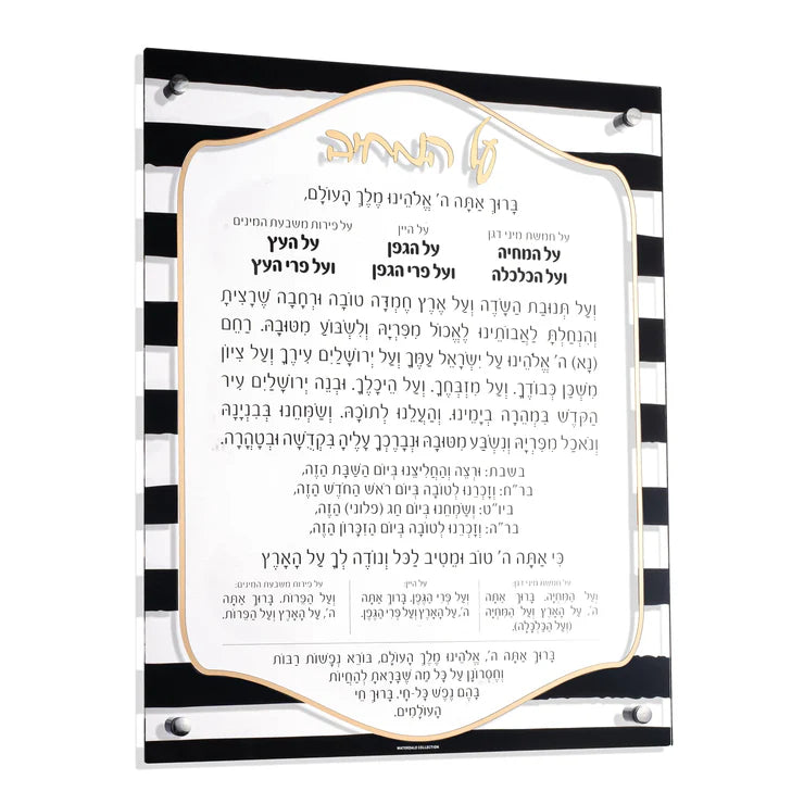 xModern meets Judaica in the Gold Onyx Al Hamichyah, a bold new take on classic lucite wall art. Featuring a sleek onyx black and white backdrop with full clear print and stunning gold mirror accents, this piece is crafted on thick, premium lucite with an easy-to-read design that’s both elegant and practical. A perfect fusion of trend and tradition, it brings a fresh, elevated look to any kitchen or dining space.