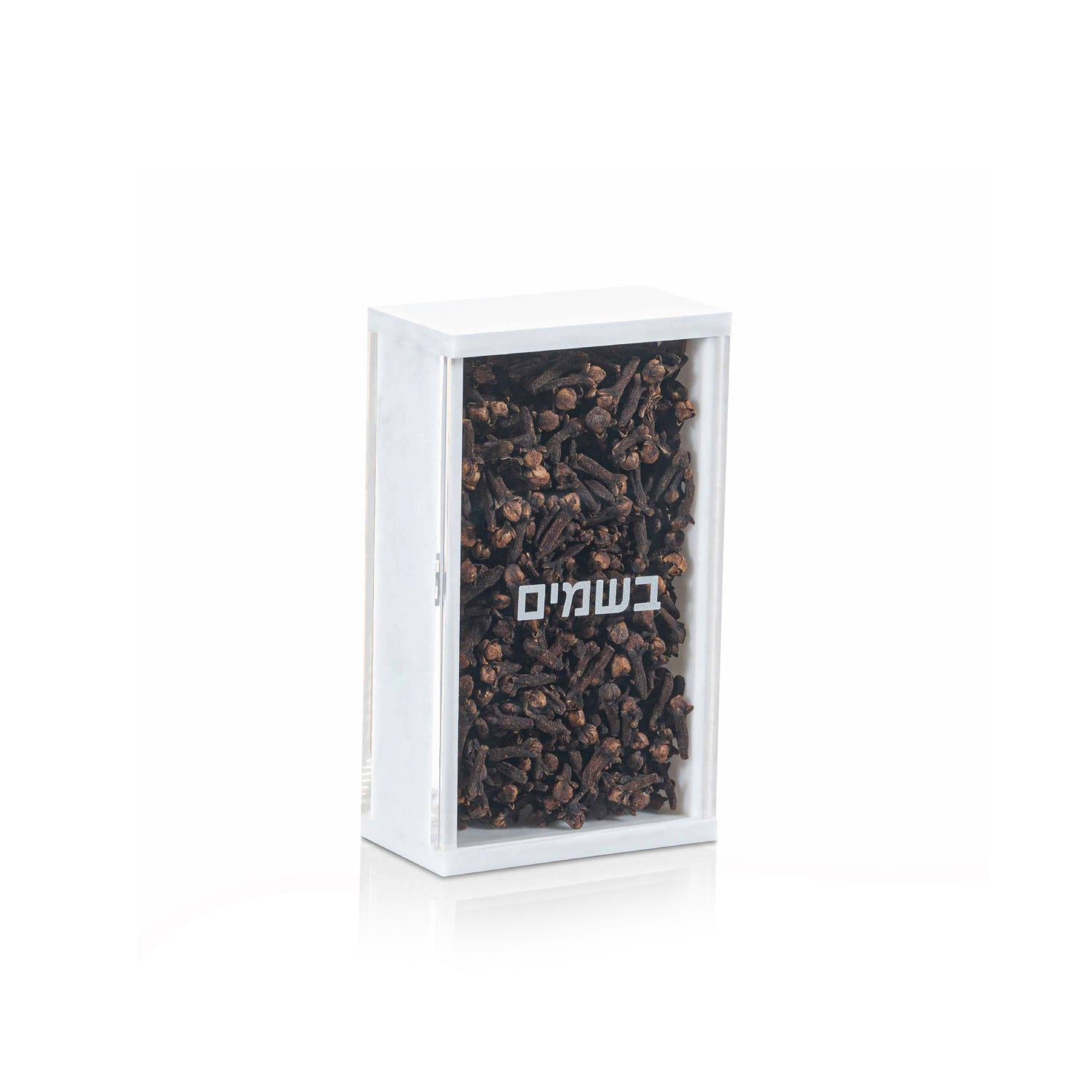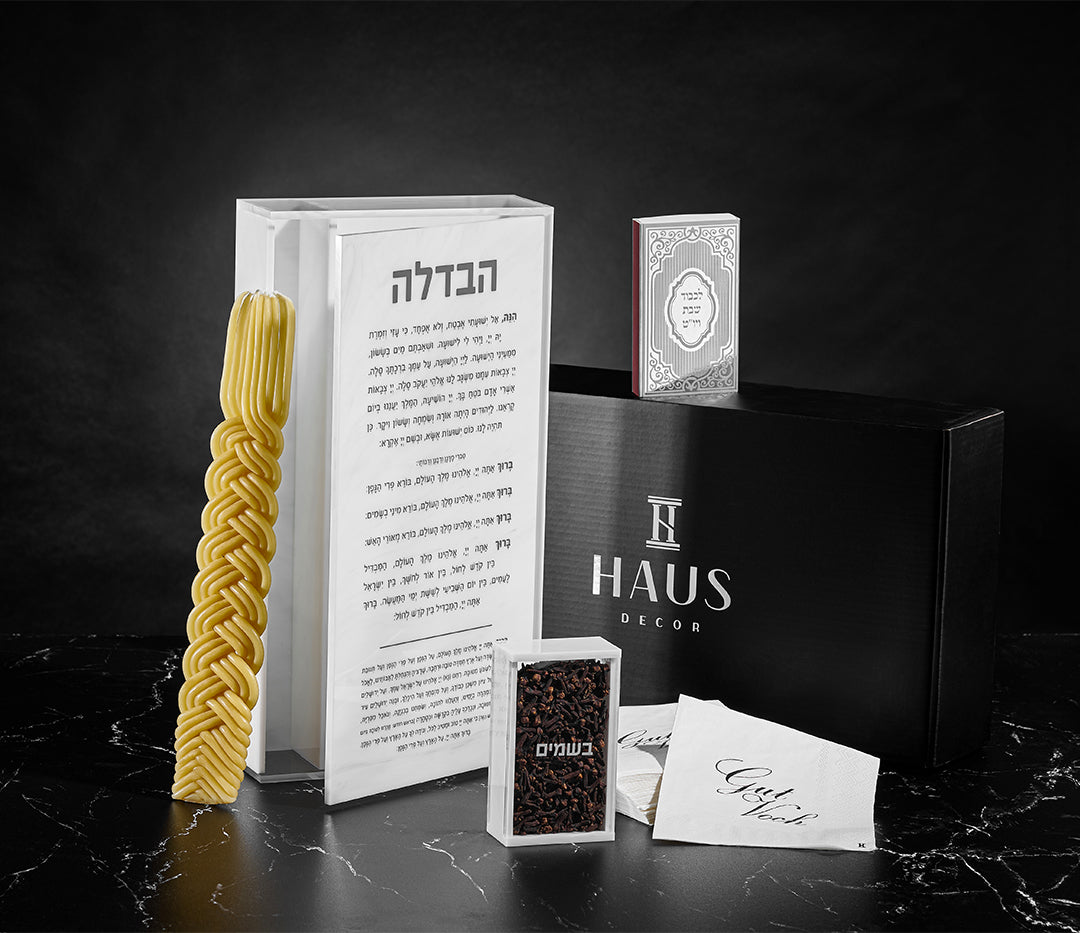 Elevate your havdalah experience with this all-inclusive, practical, and stunning Havdalah Set. Crafted from high-quality, durable, white marble lucite, this set is a true masterpiece. The cover features a clear print of "Havdalah" and "Al Hagefen", making it useful and practical. This set includes a havdalah candle, a beautiful magnetic lucite besamim holder with besamim, matches, and silver stamped 'gut voch' napkins.