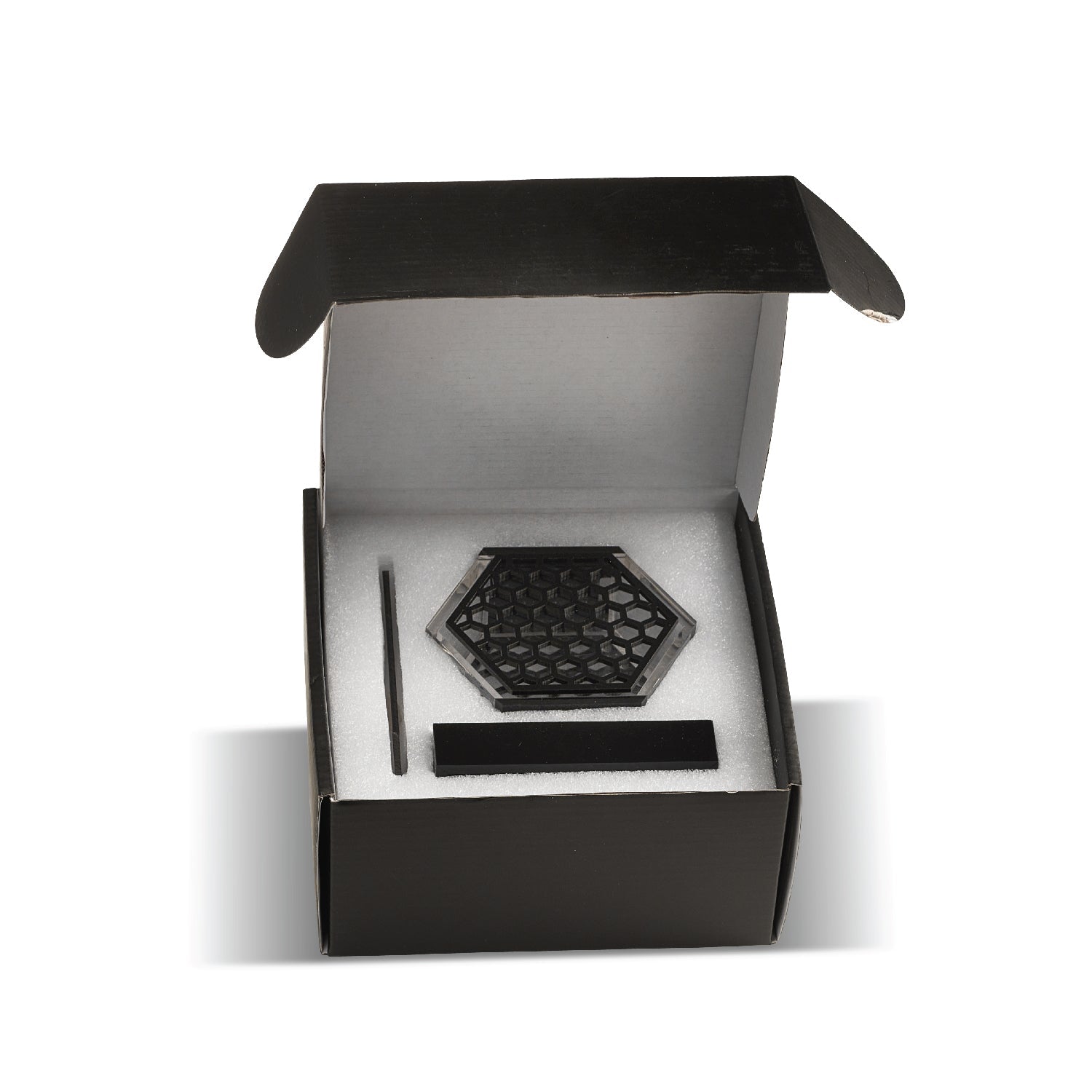 TheHoneycomb Honey Dish will add that 'wow' factor to your table. This unique modern piece, crafted from thick durable lucite, features a laser-cut honeycomb design. The dish rests upon a removable base for added height, accompanied by a sturdy spoon.The base has non-slip rubber on the bottom for added stability during use.