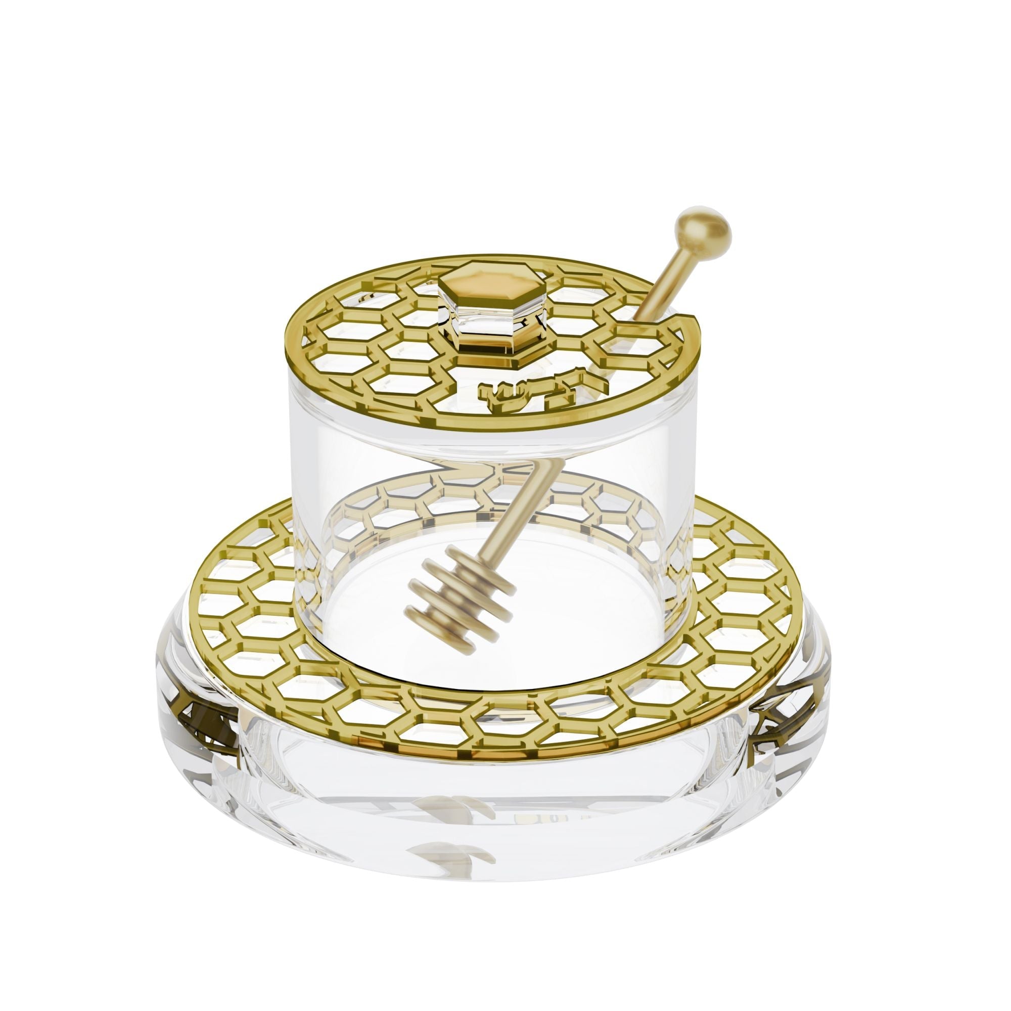 The Honeycomb Honey Dish v.2 made with clear lucite, showcases an exclusive raised 3D honeycomb design, combining modern elegance with functionality. Its drip-free base and magnetic lid provide a clean, secure experience, while the included spoon and dedicated cutout ensure effortless serving. Available in sophisticated gold or silver finishes, this dish is an exquisite addition to your Yom Tov table.4.75" diameter x 0.75" height (base)2.75" diameter x 2.4" height (honey jar)Magnetic LidSpoon IncludedThe Honeycomb Honey Dish v.2 made with clear lucite, showcases an exclusive raised 3D honeycomb design, combining modern elegance with functionality. Its drip-free base and magnetic lid provide a clean, secure experience, while the included spoon and dedicated cutout ensure effortless serving. Available in sophisticateThe Honeycomb Honey Dish v.2 made with clear lucite, showcases an exclusive raised 3D honeycomb design, combining modern elegance with functionality. Its drip-free base and magnetic lid provide a clean, secure experience, while the included spoon and dedicated cutout ensure effortless serving. Available in sophisticate