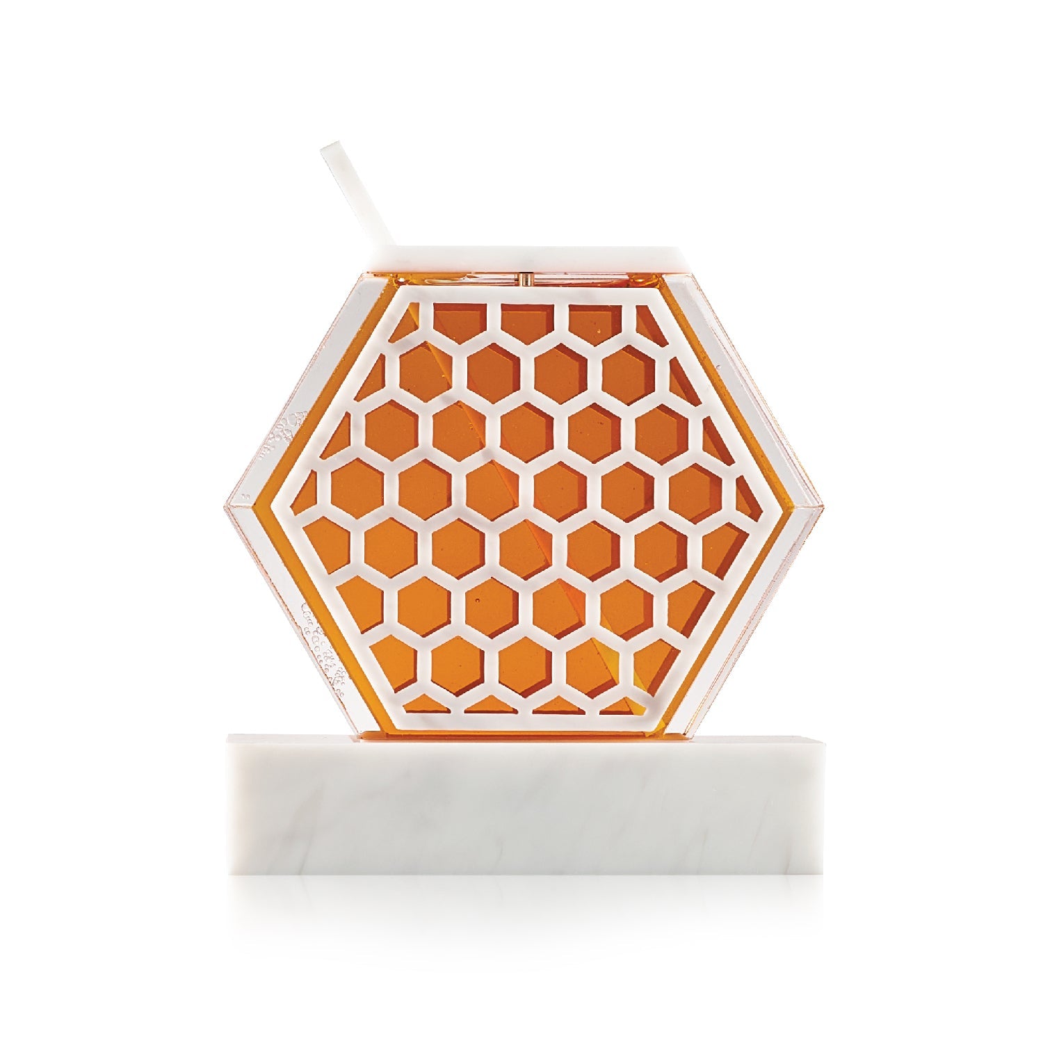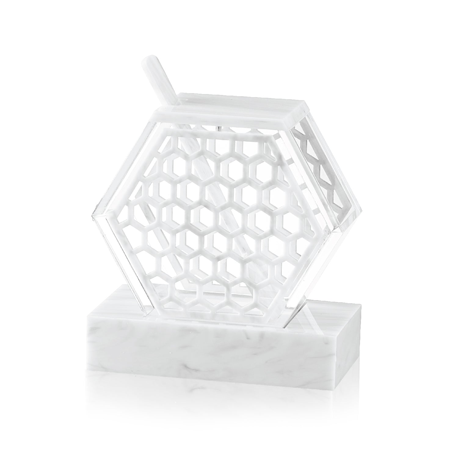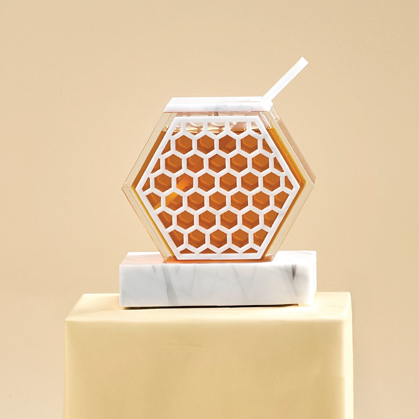 The Honeycomb Honey Dish will add that 'wow' factor to your table. This unique modern piece, crafted from thick durable lucite, features a laser-cut honeycomb design. The dish rests upon a removable base for added height, accompanied by a sturdy spoon.The base has non-slip rubber on the bottom for added stability during use.
