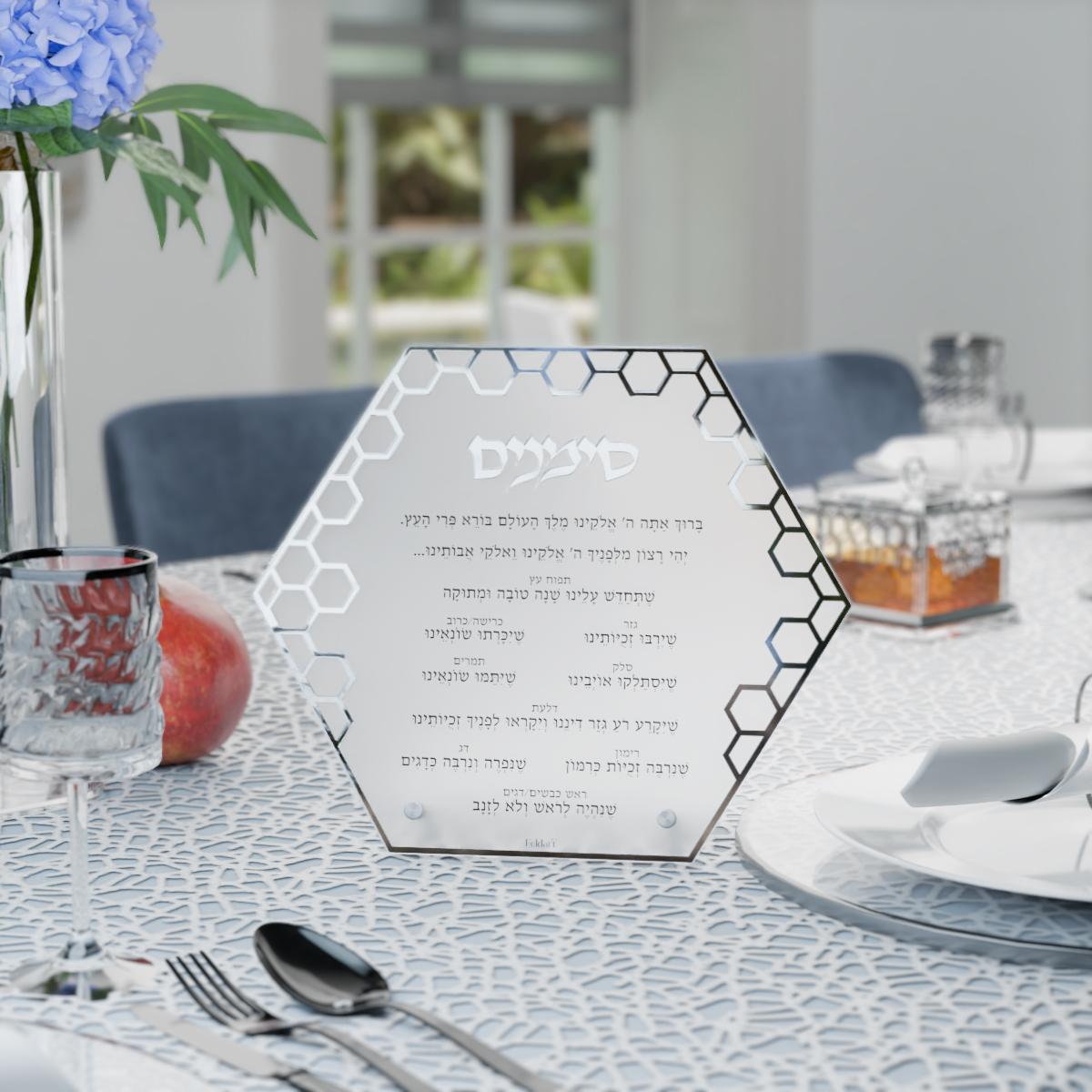 A stunningLaser Cut Honeycomb Simanim Card featuring a luxurious gold 3D raised title and honeycomb effect, is a tasteful and sophisticated addition to your Yom Tov table decor.7.9" x 6.7"Standing legs includedA stunningLaser Cut Honeycomb Simanim Card featuring a luxurious gold 3D raised title and honeycomb effect, is a tasteful and sophisticated addition to your Yom Tov table decor. 7.9" x 6.7" Standing legs includedA stunningLaser Cut Honeycomb Simanim Card featuring a luxurious gold 3D raised title and honeycomb effect, is a tasteful and sophisticated addition to your Yom Tov table decor. 7.9" x 6.7" Standing legs included
