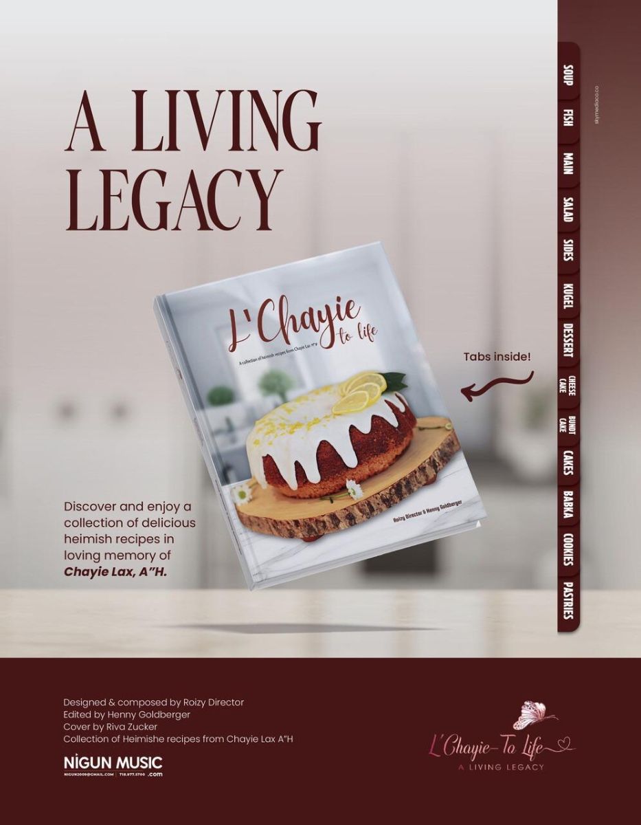 L’Chayie – To Life is a heartfelt collection of delicious heimish recipes in loving memory of Chayie Lax, A”H. Beautifully organized with tabs and full-color photos, this cookbook celebrates tradition, warmth, and legacy — one recipe at a time.