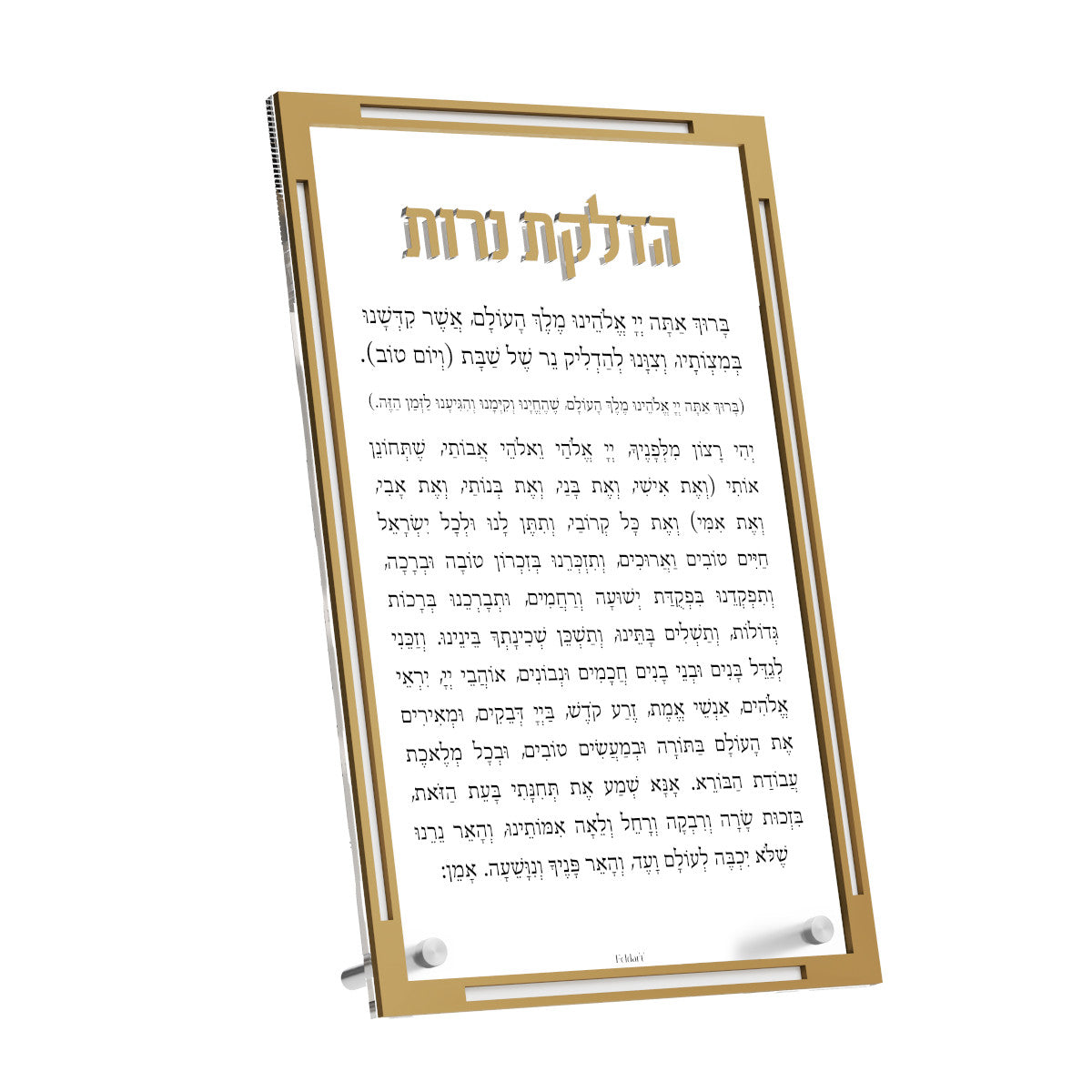 This beautiful Luxury Classic Hadlakos Neiros Tabletop Card with 3D raised title and border perfectly highlight the beauty of your Shabbos candles. A glamorous and sophisticated addition to any setting.5" x 8"Standing legs includedThis beautiful Luxury Classic Hadlakos Neiros Tabletop Card with 3D raised title and border perfectly highlight the beauty of your Shabbos candles. A glamorous and sophisticated addition to any setting. 5" x 8" Standing legs includedThis beautiful Luxury Classic Hadlakos Neiros Tabletop Card with 3D raised title and border perfectly highlight the beauty of your Shabbos candles. A glamorous and sophisticated addition to any setting. 5" x 8" Standing legs included