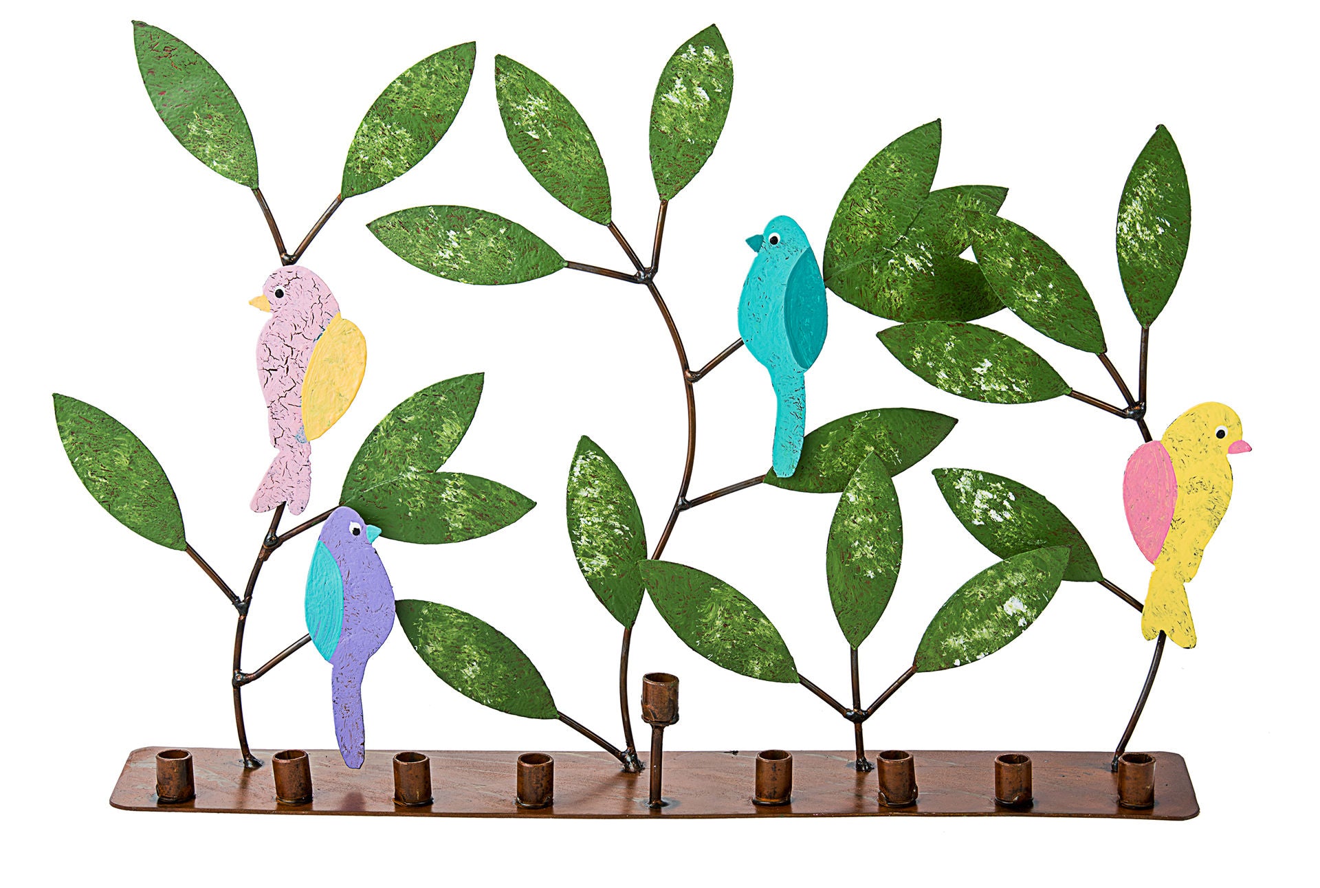 Handmade and hand painted Metal Bird menorah from Colombia. size 16 x 3 x 11 inches. From the Menorah Collection by Copa Judaica,