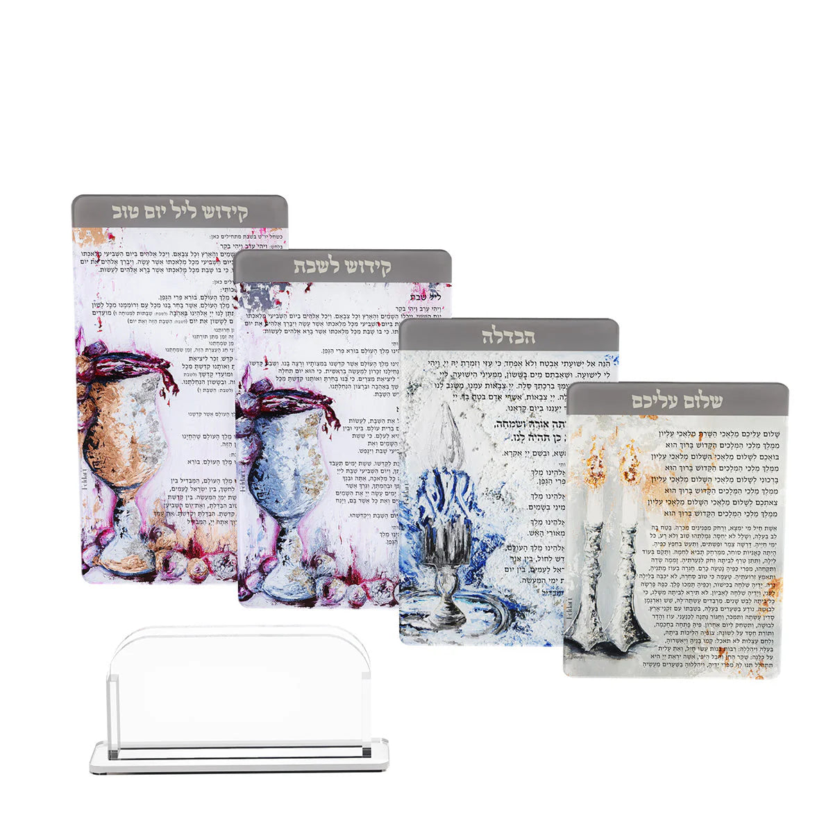 The ultimate gift! A set of four cards in a practical holder. Set contains cards for Shabbos Kiddush, Shalom Aleicheim & EIshes Chayil, Yom Tov Kiddush and Havdalah. Each acrylic card boasts a tasteful metallic header of luxurious design. Cards are presented in a vertical array, rendering them instantly accessible.