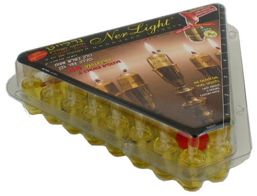 Ner Light one of the easiest way to prepare your Oil Menorah for lighting. In just seconds you can be ready to light your Menorah. All you need to do is pick up a glass vial pre - filled with pure olive oil, snap off the top with the"tool" included, and you are ready to light! Wicks are guaranteed to burn for at least 3 hours. You don't have to worry about the flames burning out, the wicks are held in place by the glass vial itself! Guaranteed to give you a bright flame! and is available in plain or multicolor olive oil. Each Triangle box contains 44 vials enough for the eight days of Chanukah.