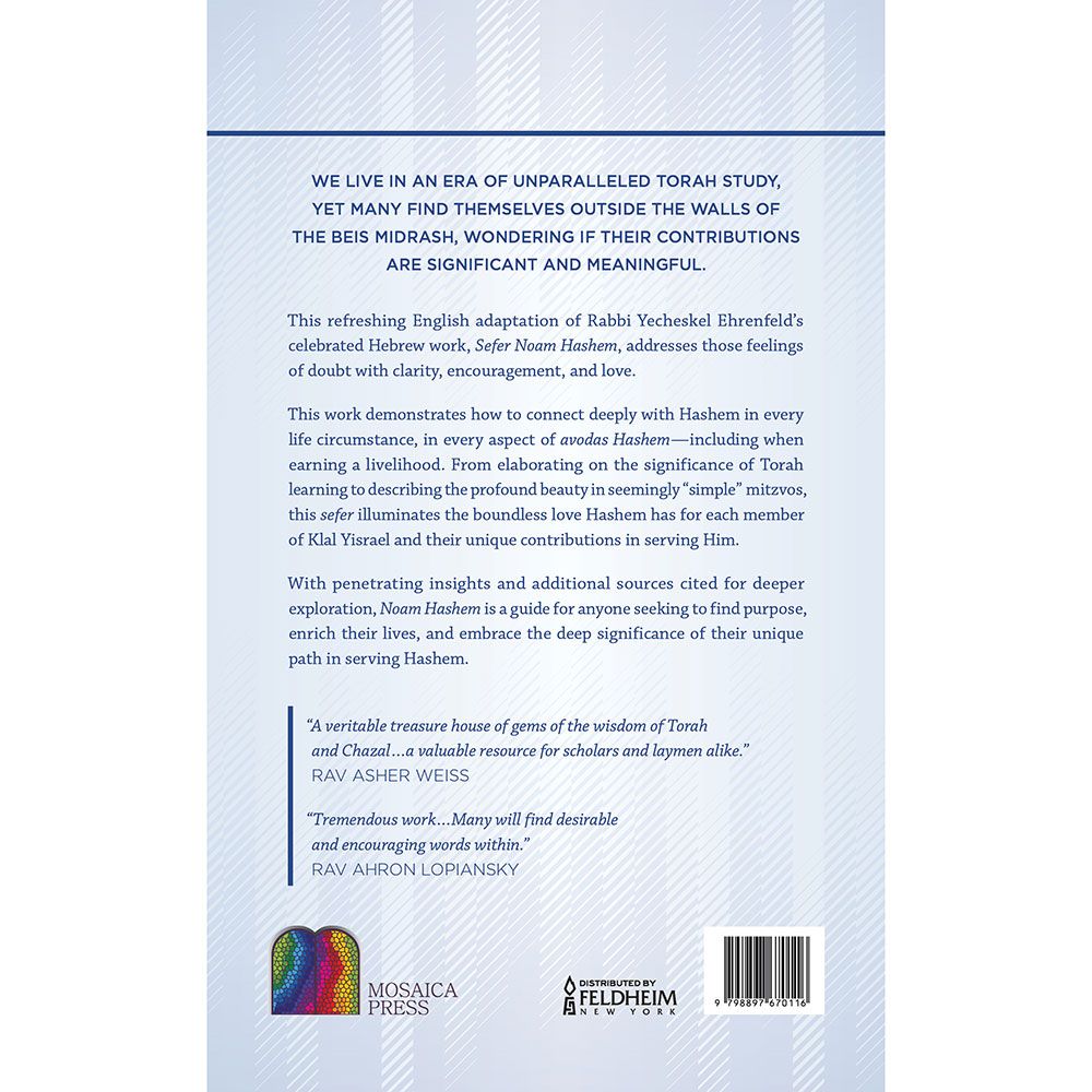 We live in an era of unparalleled Torah study, yet many find themselves outside the walls of the beis midrash, wondering if their contributions are significant and meaningful. This refreshing English adaptation of Rabbi Yecheskel Ehrenfeld’s celebrated Hebrew work, Noam Hashem, addresses those feelings of doubt with clarity, encouragement, and love.