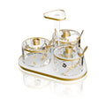 Elevate your Seder table with the Ornate Garden Seder Night Dish Set. This stunning set features three individual labelled dishes for כרפס, חרוסת and מרור, each adorned with the signature floral and branch design and its own serving spoon, all elegantly arranged on a frosted acrylic base with gold border and a central clear acrylic handle for easy passing around the table. Beautifully designed and wonderfully practical.