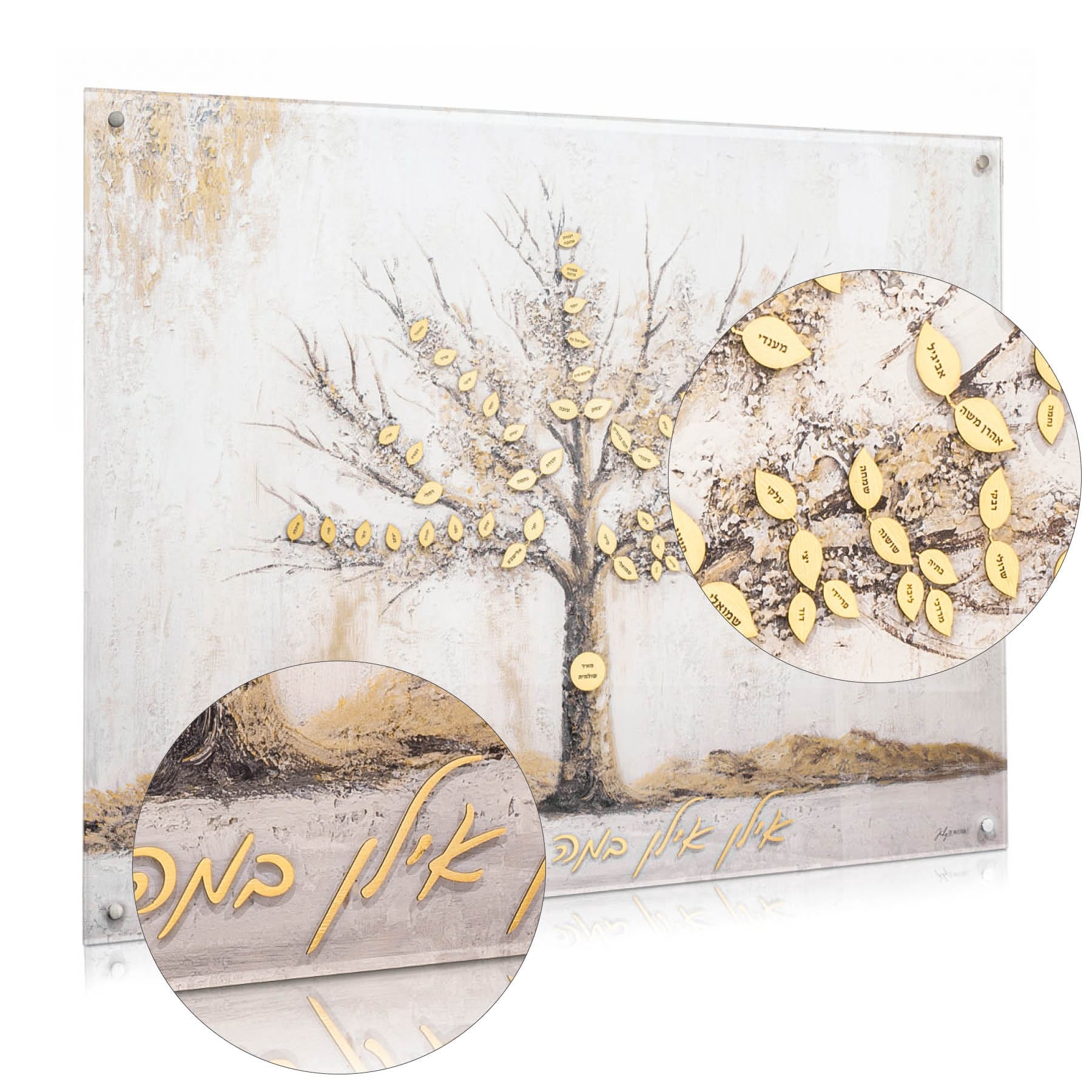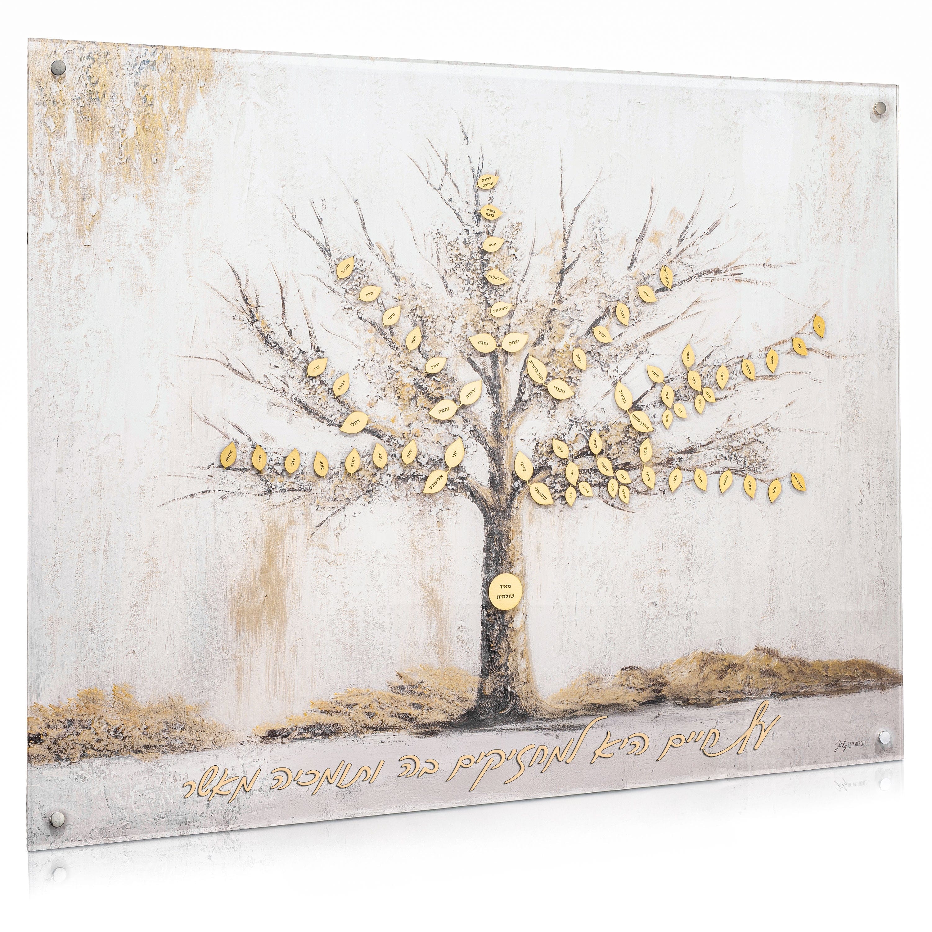 The Painted by Judy Family Tree, a beautifully designed piece printed on crystal-clear lucite with elegant gold metallic embellishments. Personalize it with gold leaves, each engraved with the names of children, grandchildren, and great-grandchildren, creating a meaningful and lasting keepsake. The perfect anniversary or birthday gift, this exquisite artwork brings warmth and elegance to any home.