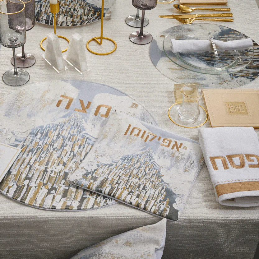 xThis magnificent Painted Leather Pesach Set is a must have for every home on Pesach! Artistic, stunning! Set your Seder table in style with the full four piece set. Appreciate the practicality of our wipe down & machine washable sets. No more worries about spills! Premium quality & feel! Includes a heavy duty plastic case for storage. Enjoy usage year after year on these uniquely designed one-of-a-kind Pesach Sets!Includes pillow case, matzah cover (has 3 compartments), afikoman bag, and towelFaux leatherWipe downBacked with a layer of cottonCoordinate with the Seder Plate, Matzah Box & Lucite Table Charger in this set.This magnificent Painted Leather Pesach Set is a must have for every home on Pesach! Artistic, stunning! Set your Seder table in style with the full four piece set. Appreciate the practicality of our wipe down & machine washable sets. No more worries about spills! Premium quality & feel! Includes a heavy duty pThis magnificent Painted Leather Pesach Set is a must have for every home on Pesach! Artistic, stunning! Set your Seder table in style with the full four piece set. Appreciate the practicality of our wipe down & machine washable sets. No more worries about spills! Premium quality & feel! Includes a heavy duty p