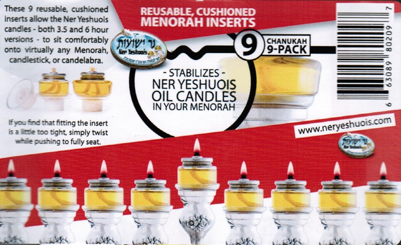These 9 reusable, cusioned inserts allow the Ner Yeshuois candles - both the 3.5 and 6 hours versions - to sit comfortably onto virtually and Menorah, Candlestick, or Candelabra.SkuC-NY04These 9 reusable, cusioned inserts allow the Ner Yeshuois candles - both the 3.5 and 6 hours versions - to sit comfortably onto virtually and Menorah, Candlestick, or Candelabra.These 9 reusable, cusioned inserts allow the Ner Yeshuois candles - both the 3.5 and 6 hours versions - to sit comfortably onto virtually and Menorah, Candlestick, or Candelabra.SkuC-NY04