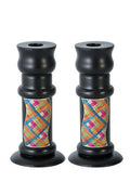 Wood candle sticks with straw pattern. Made in Colombia. Size 6 1/4 high and 2 3/4 in diameter. From the Shabbat Collection by Copa Judaica