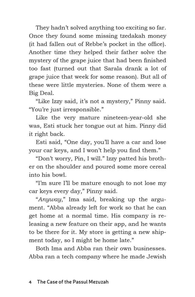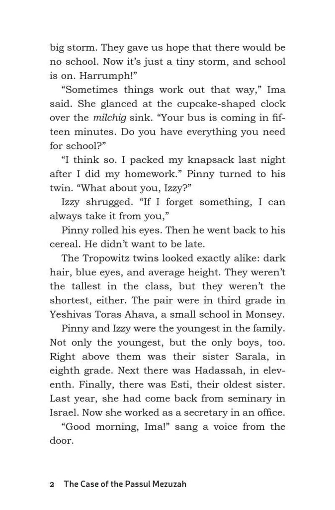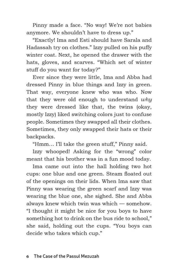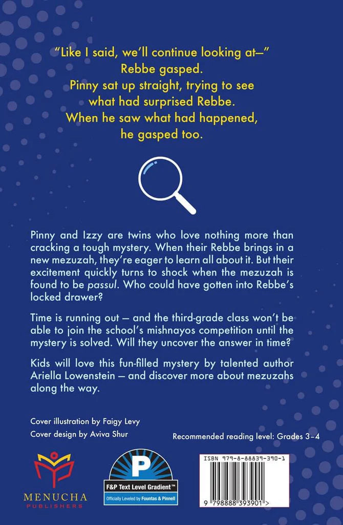 Pinny and Izzy are twins who love nothing more than cracking a tough mystery. When their Rebbe brings in a new mezuzah, they’re eager to learn all about it. But their excitement quickly turns to shock when the mezuzah is found to be passul. Who could have gotten into Rebbe’s locked drawer?