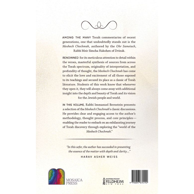 In this volume, Rabbi Immanuel Bernstein presents a selection of the Meshech Chochmah’s classic discussions. He provides clear and engaging access to the author’s methodology, thought process, and core principles — enabling the reader to embark on an exhilarating journey of Torah discovery through exploring the “world of the Meshech Chochmah.”