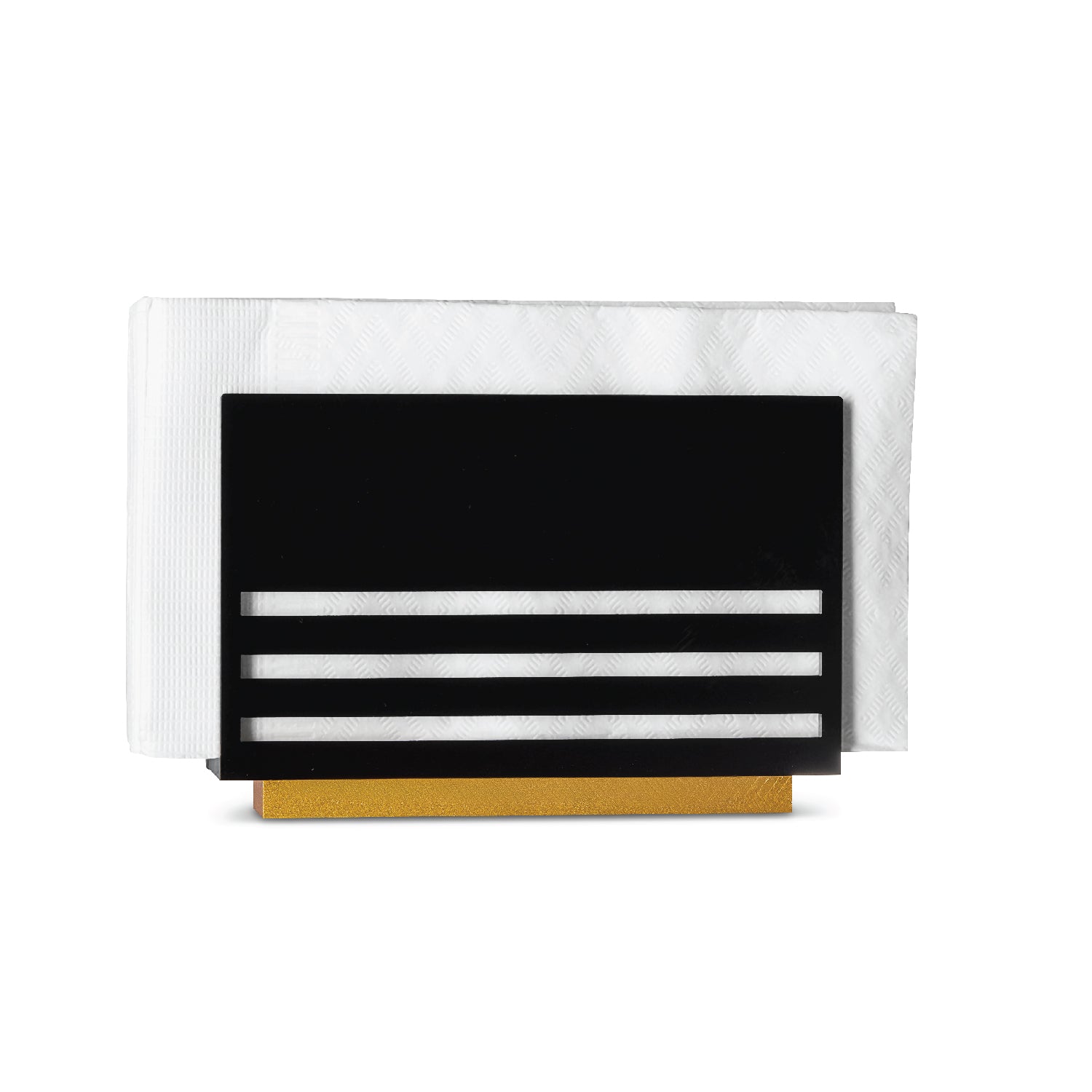 xThe Triple Line Napkin Holder brings modern elegance to your table. Featuring a sleek, laser-cut design, this holder is enhanced with a painted gold base for a touch of sophistication. Ideal for both everyday and Shabbos use.