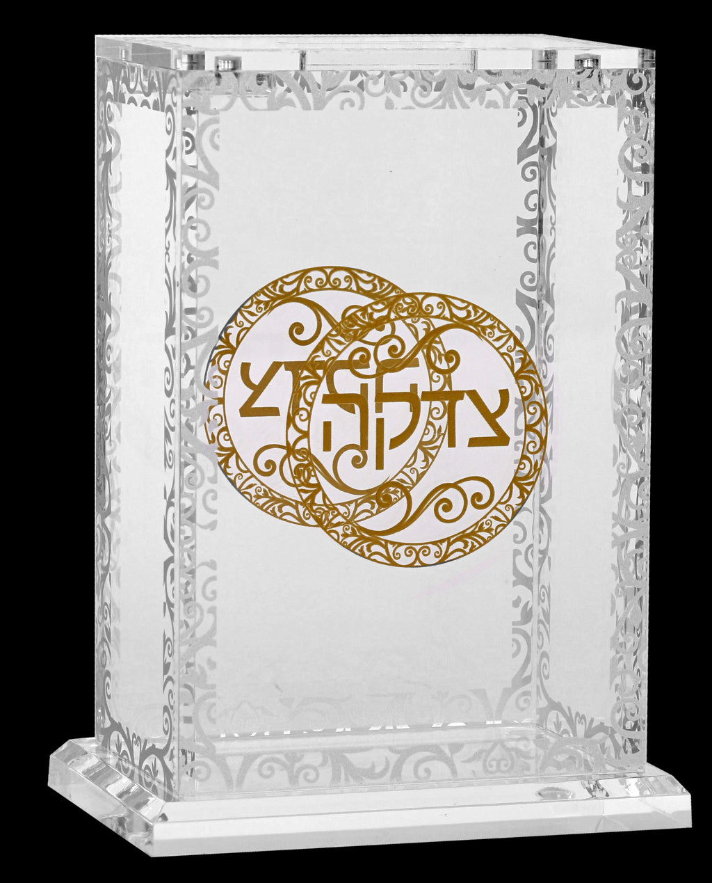 SkuCJ-182031Barcode6035301820310MaterialLuciteColorClear,GoldSize3" x 4" x 5.5"Tzedakah Box Acrylic With Gold Royal DesignSkuCJ-182031Barcode6035301820310MaterialLuciteColorClear,GoldSize3" x 4" x 5.5"