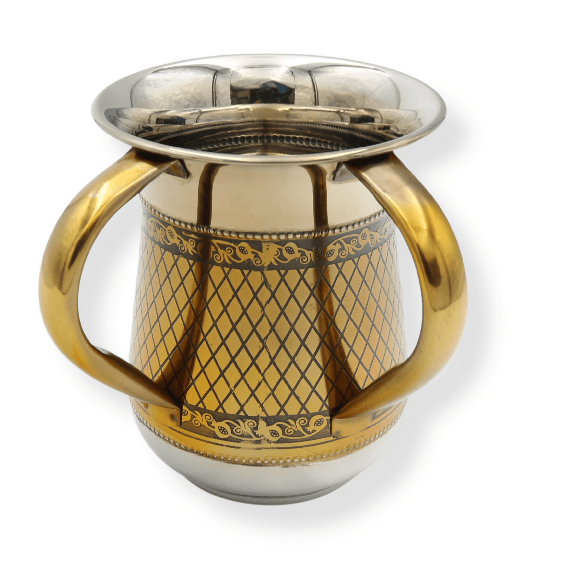 Wash Cup Stainless Steel - Copper veil with pomegranate ribbon design. Netillat Yadayimstamp.Size 5.5"HItem SKU #WC806Wash Cup Stainless Steel - Copper veil with pomegranate ribbon design. Netillat Yadayimstamp. Size 5.5"H Item SKU #WC806Wash Cup Stainless Steel - Copper veil with pomegranate ribbon design. Netillat Yadayimstamp. Size 5.5"H Item SKU #WC806