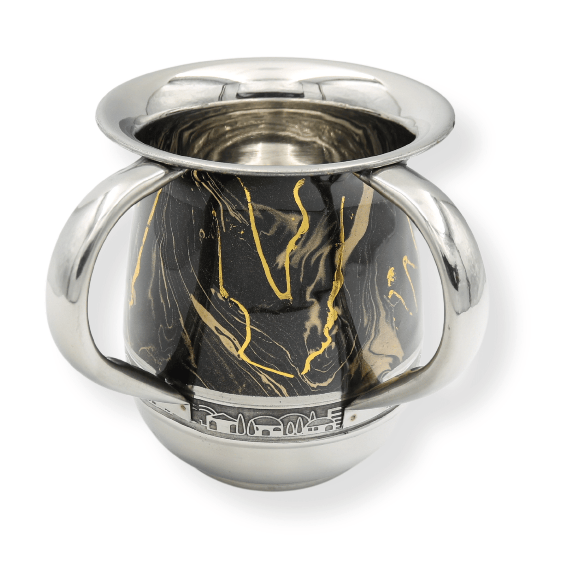 Wash Cup Stainless Steel - black marble with cream veins and gold highlights. Jerusalem theme ribbon design.