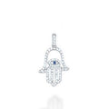 Petite14K white gold hamsa encrusted with full cut diamonds. In the center is an eye that set with a blue sapphire.Highly polished bale provides elegant contrast. Sold complete only with an 18 inch 14K white gold box style chain. Made in the USA. From the diamond collection by House of Raasche. 0.35ct of full cut diamonds