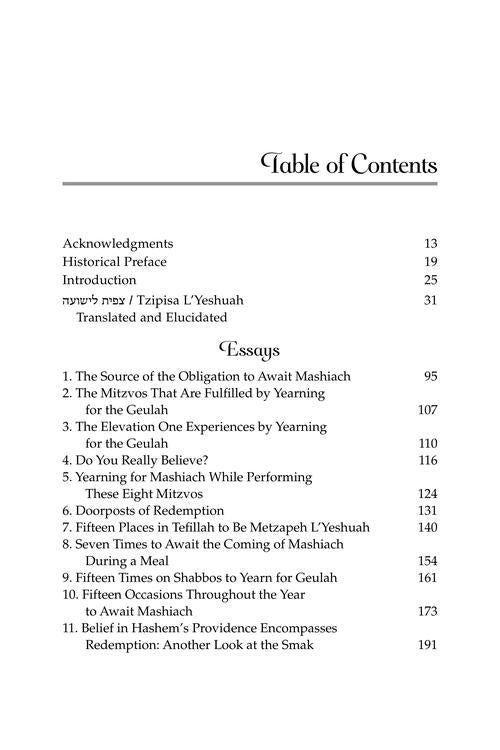 The Classic Treatise ofThe Chofetz ChaimTranslated and Elucidated,with Stirring Essays onAwaiting the Coming of MashiachIn his powerful sefer, Tzipisa L'Yeshuah, the Chofetz Chaim teaches that yearning for Moshiach is not only one of our greatest obligations - it may also be the very merit that brings the Geulah.Now you can explore the Chofetz Chaim's timeless cry for redemption through the lens of the acclaimed Torah scholar, Rav Daniel Glatstein. Tzipisa L'Yeshuah Yearning for Redemption includes the Hebrew text of the sefer, a translation and elucidation, and a collection of Rav Glatstein's stirring essays that bring to light the urgency, clarity, and passion with which the Chofetz Chaim lived the hope for Moshiach.In these illuminating essays you will explore such topics asWhy "Did you await the redemption?" is among the six fundamental questions every soul is asked in the Heavenly CourtHow the Rambam's Thirteen Principles of Faith require both belief in Mashiach and daily anticipation of his coming.The profound connection between Yetzias Mitzrayim (the Exodus) and the Final Redemption, and how every mitzvah that recalls the Exodus inspires faith in Mashiach.The numerous junctures throughout our tefillos that can serve as opportunities to await redemptionThe unique mitzvos and pesukim that are fulfilled simply by yearning for salvation.Insights into how although Moshiach did not come for the greatest Torah luminaries of earlier generations, it is even more likely to come in our times.Discover how the Chofetz Chaim and our sages throughout the generations teach that yearning for Moshiach is not merely a hope, but a transformative force - a core aspect of Jewish faith that brings us closer to redemption every single day.Yearning For Redemption Now more than ever, a clarion call to every Jew.Watch the Inside Artscroll interviewTzipisa L'Yeshuah, Yearning for RedemptionSkuTZIPHAuthorRabbi Daniel GlatsteinIsbn 139781422644911Isbn 10142264491XPages282Size6.3" x 9.3"BindingHardcoverDate7162025ImprintArtscroll Mesorah PublicationsThe Classic Treatise of The Chofetz Chaim Translated and Elucidated, with Stirring Essays on Awaiting the Coming of Mashiach In his powerful sefer, Tzipisa L'Yeshuah, the Chofetz Chaim teaches that yearning for Moshiach is not only one of our greatest obligations - it may also be the very merit that brings the Geulah. Now you can explore the Chofetz Chaim's timeless cry for redemption through the lens of the acclaimed Torah scholar, Rav Daniel Glatstein. Tzipisa L'Yeshuah Yearning for Redemption includes the Hebrew text of the sefer, a translation and elucidation, and a collection of Rav Glatstein's stirring essays that bring to light the urgency, clarity, and passion with which the Chofetz Chaim lived the hope for Moshiach. In these illuminating essays you will explore such topics as Why "Did you await the redemption?" is among the six fundamental questions every soul is asked in the Heavenly Court How the Rambam's Thirteen Principles of Faith require both belief in Mashiach and daily anticipation of his coming. The profound connection between Yetzias Mitzrayim (the Exodus) and the Final Redemption, and how every mitzvah that recalls the Exodus inspires faith in Mashiach. The numerous junctures throughout our tefillos that can serve as opportunities to await redemption The unique mitzvos and pesukim that are fulfilled simply by yearning for salvation. Insights into how although Moshiach did not come for the greatest Torah luminaries of earlier generations, it is even more likely to come in our times. Discover how the Chofetz Chaim and our sages throughout the generations teach that yearning for Moshiach is not merely a hope, but a transformative force - a core aspect of Jewish faith that brings us closer to redemption every single day. Yearning For Redemption Now more than ever, a clarion call to every Jew. Watch the Inside Artscroll interview Tzipisa L'Yeshuah, Yearning for RedemptionThe Classic Treatise ofThe Chofetz ChaimTranslated and Elucidated,with Stirring Essays onAwaiting the Coming of Mashiach In his powerful sefer, Tzipisa L'Yeshuah, the Chofetz Chaim teaches that yearning for Moshiach is not only one of our greatest obligations - it may also be the very merit that brings the Geulah. Now you can explore the Chofetz Chaim's timeless cry for redemption through the lens of the acclaimed Torah scholar, Rav Daniel Glatstein. Tzipisa L'Yeshuah Yearning for Redemption includes the Hebrew text of the sefer, a translation and elucidation, and a collection of Rav Glatstein's stirring essays that bring to light the urgency, clarity, and passion with which the Chofetz Chaim lived the hope for Moshiach. In these illuminating essays you will explore such topics asWhy "Did you await the redemption?" is among the six fundamental questions every soul is asked in
